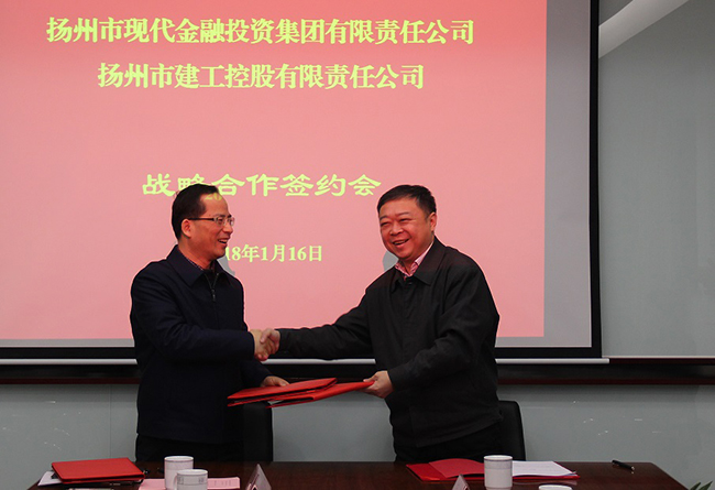 1月16日下午,揚州建工控股有限責任公司與揚州市現代金融投資集團有限責任公司(下稱“金融集團”)舉行戰略合作簽約會。公司董事長王宏、副總經理程杰,金融集團董事長龔振志、總經理劉研等出席簽約會。