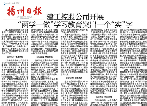 今天出版的《揚州日報》B4“揚州建工”專版刊登了建工控股“兩學一做”學習教育進展情況,主要內容如下: