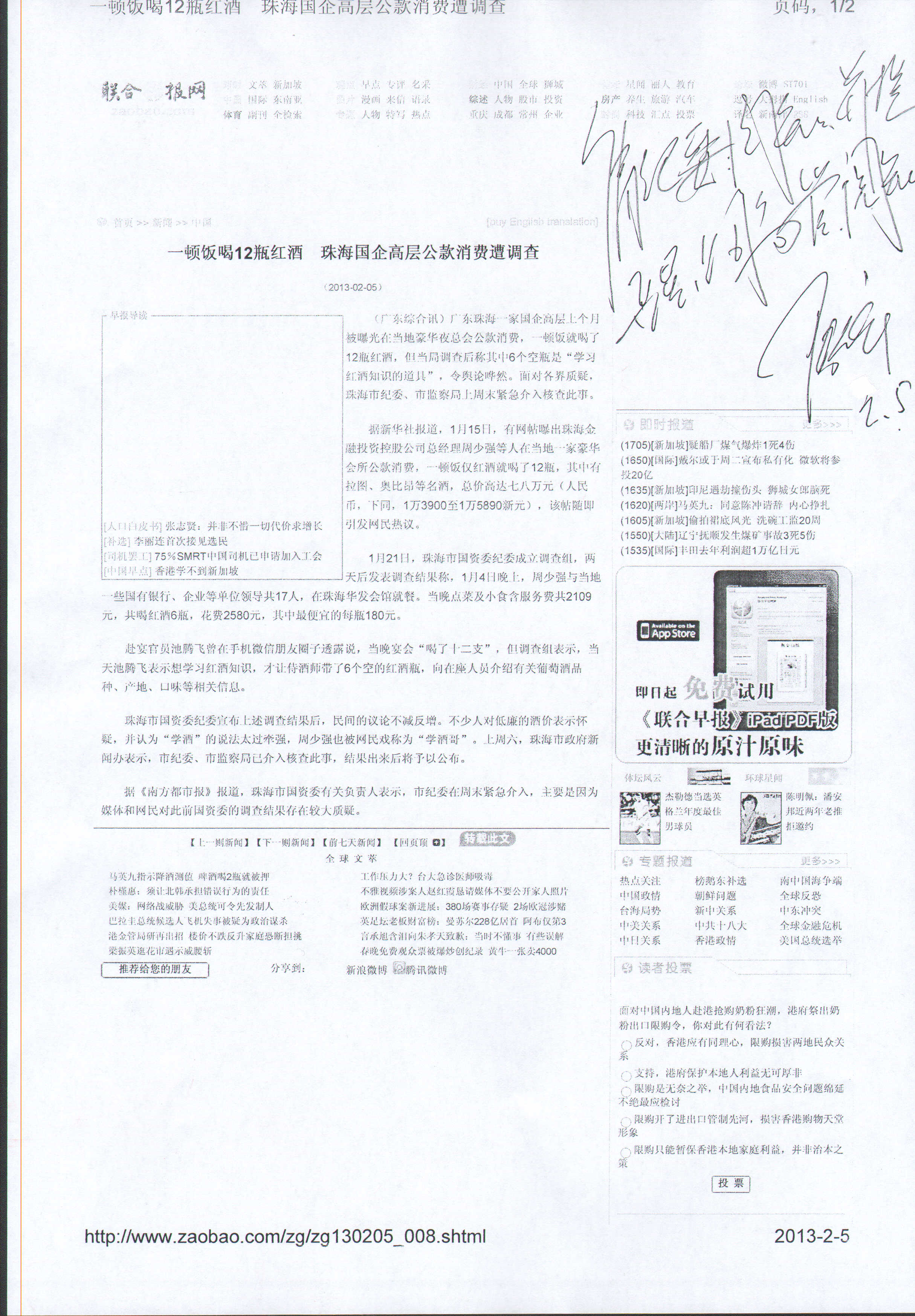 陸金龍董事長對網載“珠海國企高層公款消費”作出批示,提醒公司高管引以為戒 時間:2013-02-065033 陸金龍董事長對網載“珠海國企高層公款消費” 作出批示,提醒公司高管引以為戒 2月5日聯合早報網登刊信息“一頓飯喝12瓶紅酒 珠海國企高層公款消費遭調查”,陸金龍董事長即日批示:“請紀委閱知,并提醒公司高管閱知”。公司紀委、紀監室也當即將此精神向公司上下作了傳達,要求嚴格按公司廉政細則十二條辦事,如有違犯將層層追究責任。